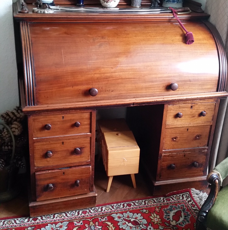 For years I used to dream about this desk. It belonged to my father’s doctor, and I used to love watching the top roll up and down, revealing and hiding all his papers, at will. This feeling of immense latent power came back to me some months ago when we were invited to some friends’ house for dinner and I was admiring the furnishings. I mentioned the desk and was told it was the very one I had longed for as a child.
