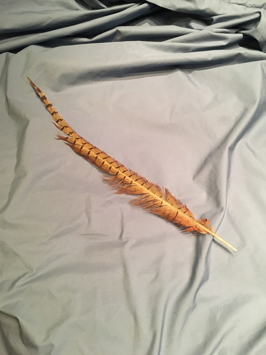 There were lots of feathers around and Andrzej explained they were from pheasants. I had never seen or heard of such a bird and I thought they were beautiful. He picked one out for me and handed it to me with a flourish. (Maybe I’ve imagined the flourish. But I like to remember it that way.)