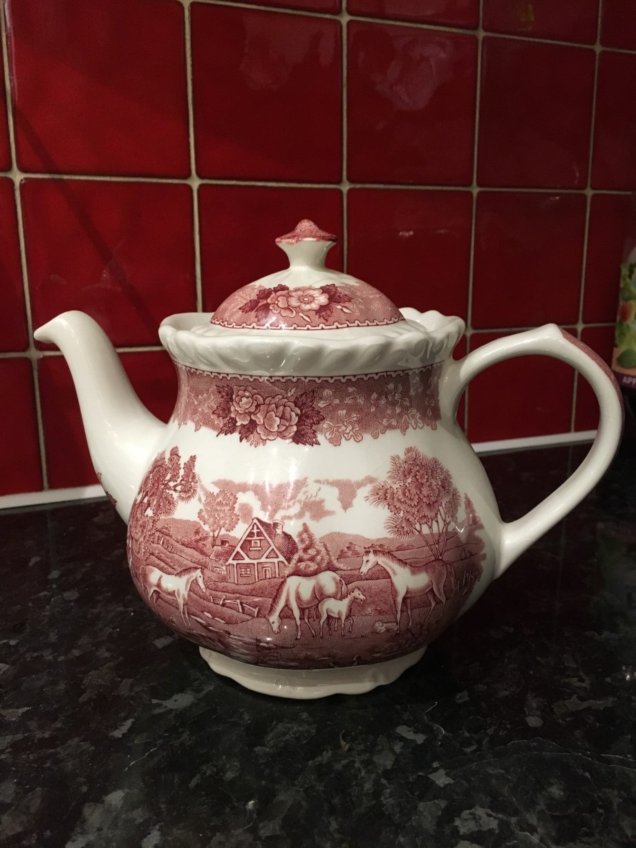 Arcadia. The countryside. Horses. Pink. Wooden barns. None of these symbols of joy have ever had much meaning for me. Yet this is one of my most treasured objects. It came as part of a large tea and coffee service most of which I still have, but this teapot is what I have used the most in the last forty years!