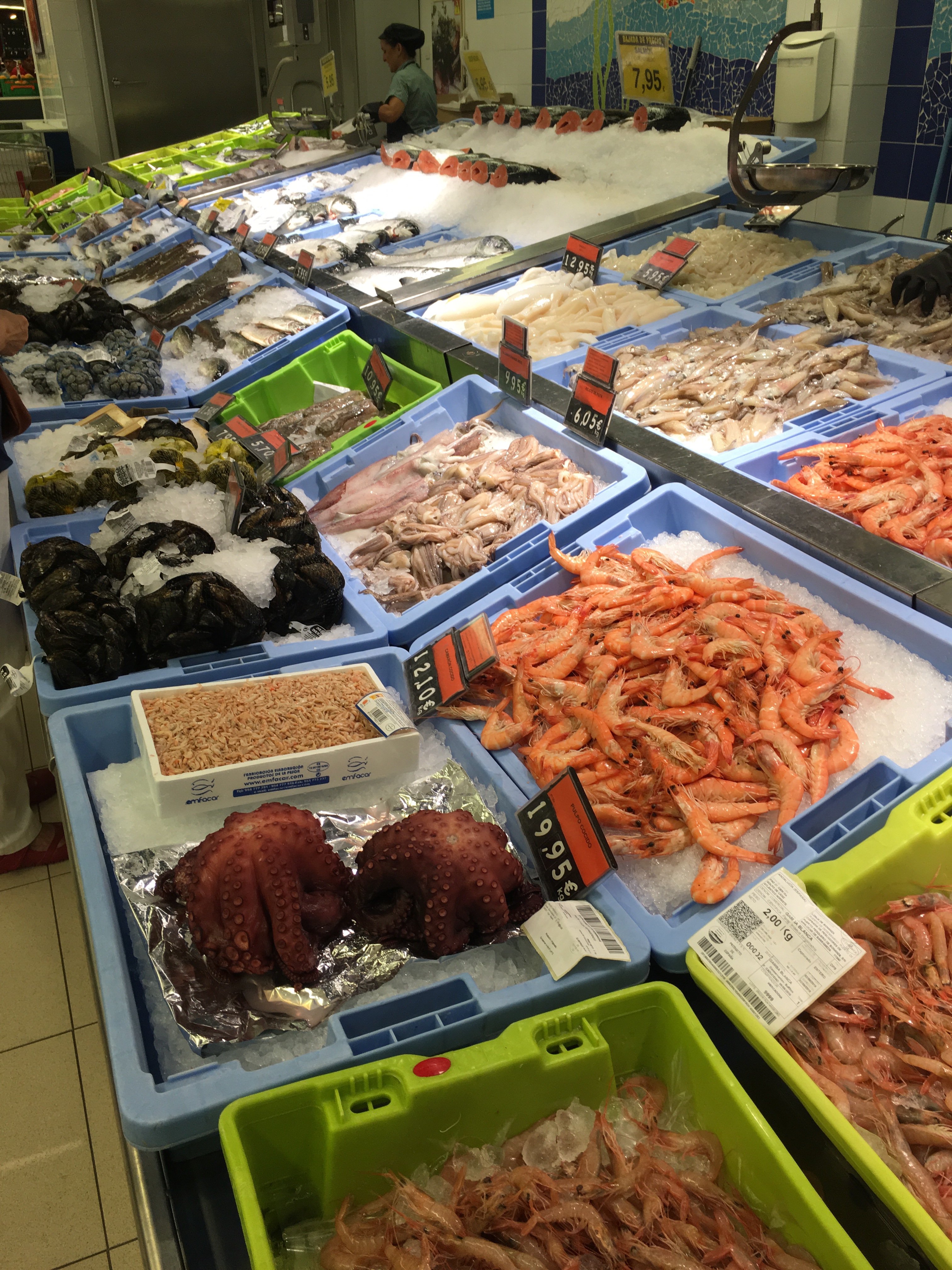And then there was the highlight of the day. Going shopping. To the supermarket. Mercadona. Here we bought water in five litre cans. Bread. Lomo. Olive oil and fish. The fish counter was the most entertaining. A lot of the fish were still alive so occasionally you’d see crabs and other creatures moving on the floor. Everything was laid out on masses of ice and it was all very colourful. Lots of local women buying up the daily catch, carefully, questioning every sardine and whelk. A few tourists struggling with their choices and making themselves understood. And us. I nominally speak Spanish but there’s not much about fish in the literature I studied.