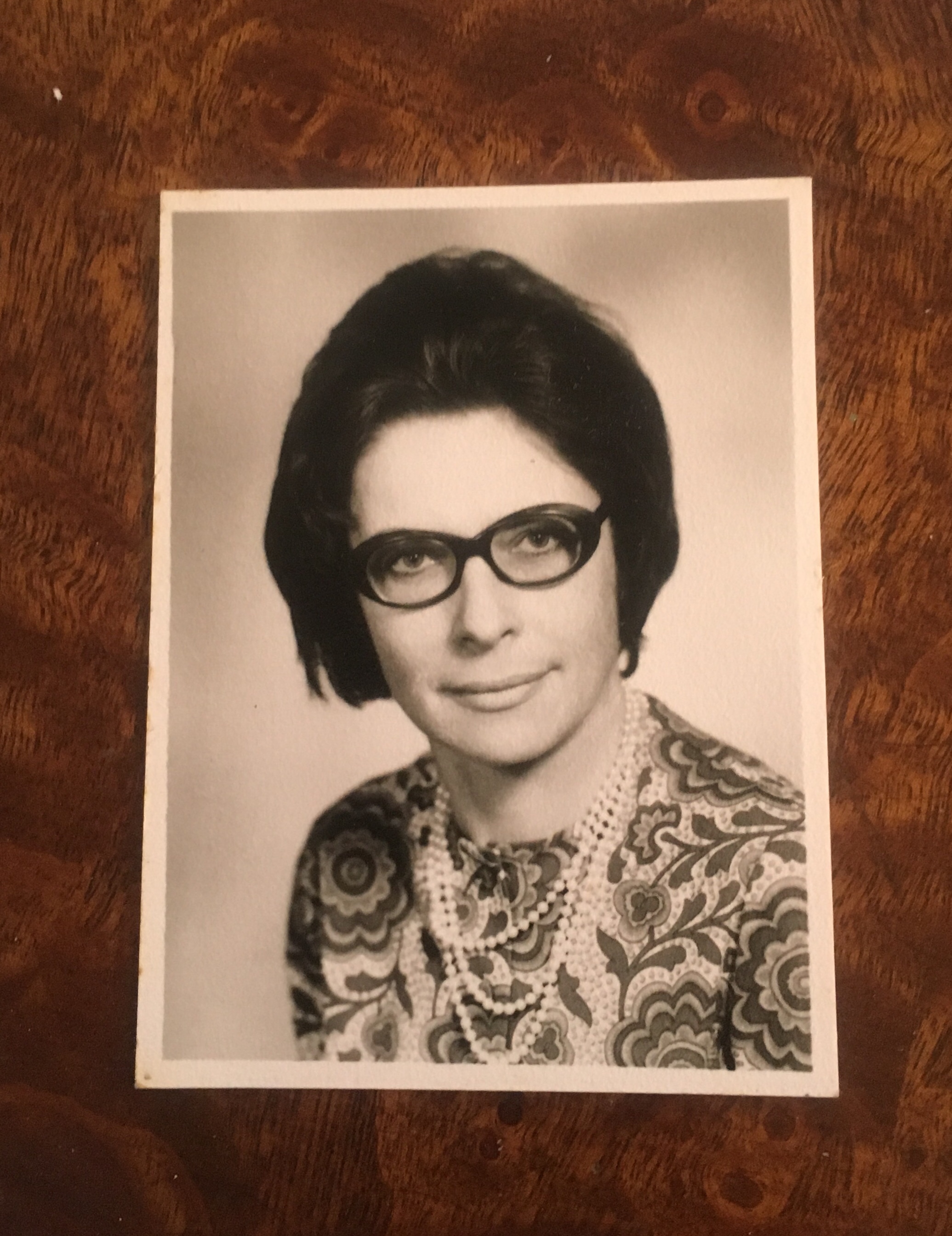 My mother went to a professional photographer, Julia Bennett Studios in Oxford Street, to have this portrait taken. I presume it was for a passport. I have been trying to work out when it was taken, because she never actually looked like that. The dress is polyester, so it must have been taken in the very early 60s. She must be about 35. The pearls I still have.