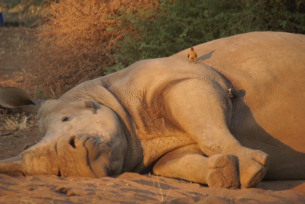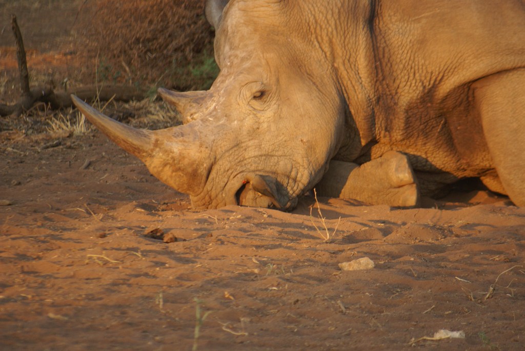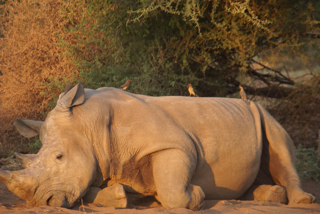 Here is Daddy Rhino. He is fast asleep and very happy. The water hole is near by, the jackal has already laid waste to the blue birds, and all is well with the world. It’s about six o’clock in the morning and most of the animal kingdom is alert and ready for the day. But papa rhinoceros is just relaxing, the little oxpecker birds are cleaning him up, removing all the nasty parasites and ticks which could make his life very unpleasant.