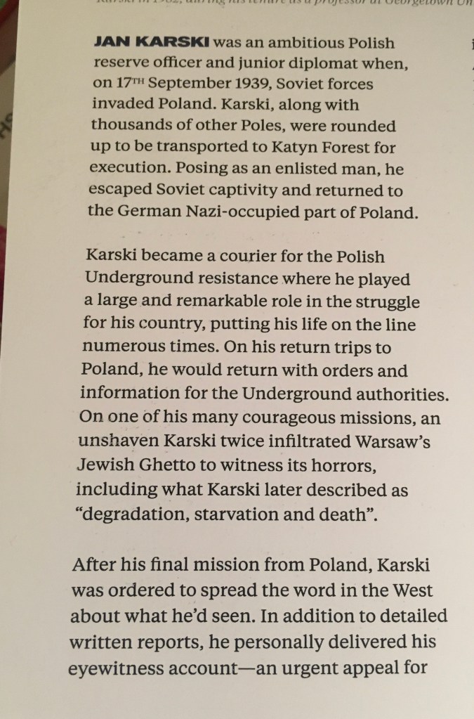 And what a performance. David Strathairn was the very embodiment of Jan Karski. 90 minutes on stage. Always mobile, he grew from a very little boy to a diplomat to an adventurer to a courier to a broken (not quite) man to a university lecturer. Karski was a man who had a story to tell. A true story. A horror story. The most awful story. And he told it to many important and influential people. Yet, like Coleridge’s Ancient Mariner, his story fell on deaf”-ish” ears. If they believed his account of the ghettos and the concentration camp they did nothing. Roosevelt didn’t even want to listen.