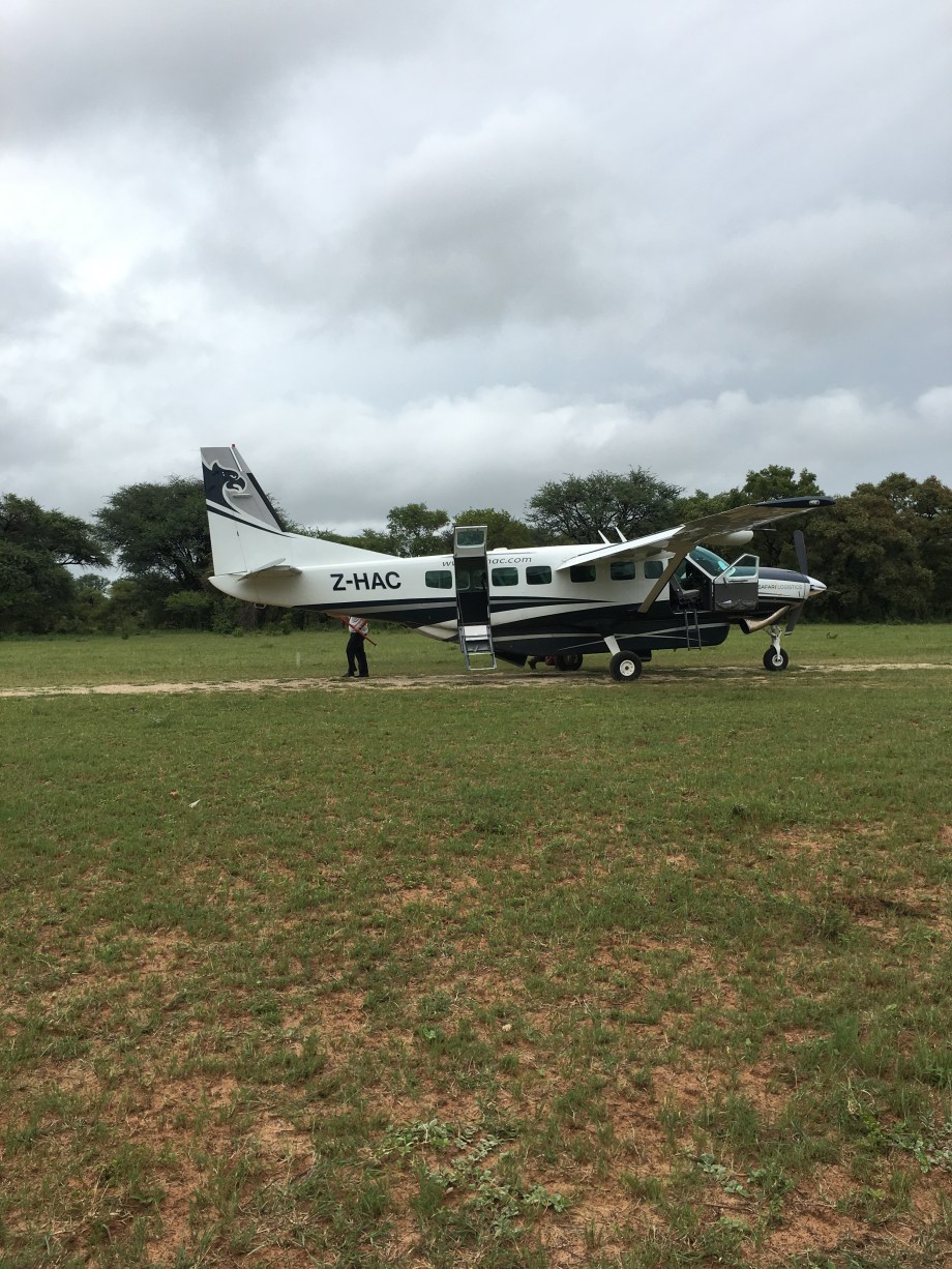 In a covered car. What a treat. To the airstrip. Elephants and buffalo on the way. And loads of donkeys. Donkeys in Zimbabwe very healthy looking. Donkeys pulling carts=Kalahari Ferrari.