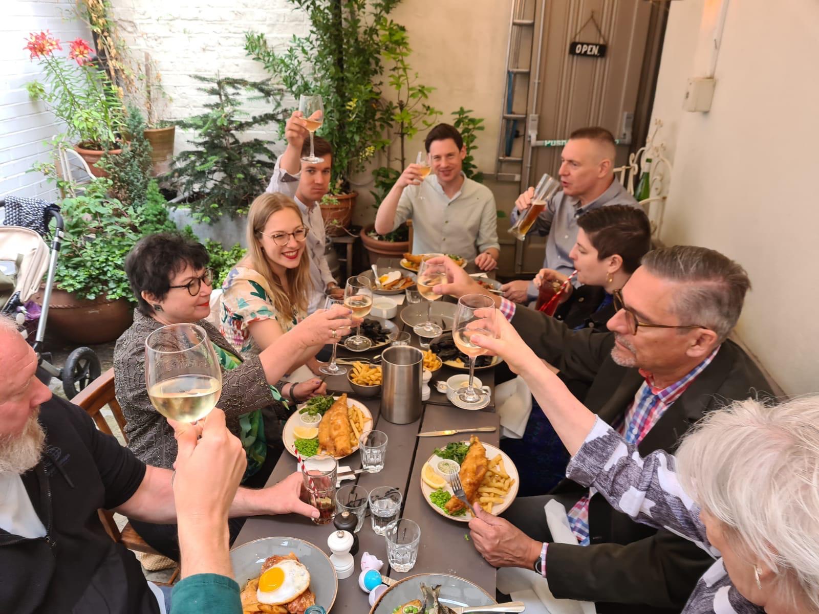 They had hired the back yard of the local pub, and we were all gathered, and the bubbles were beginning to flow. Very nice. But I needed to go to the loo and suddenly my son said I’ll show you where. I was a bit mystified as I can usually find my own way to these places, but I thought how nice – maybe he wants to talk to me about something. Anyway, he pointed me in the right direction and I half noticed him leaving the pub. I didn’t think anything of it, but was a bit surprised again when he said he’d walk me back to the party. Which he did. A drink was put into my hand and I was about to settle down with a menu when a couple walked into our area. I looked up and this woman rushed up to me with a big grin on her face. Who was she? My eldest daughter! I was so taken aback. I think I probably screamed. A couple of weeks previously I had suffered a bitter disappointment when she was yet again stopped from coming down to London because of Covid difficulties in Bolton where she lives. I had no idea she had been invited let alone that was going to be here. So I didn’t recognise her or her fiance – they had also got engaged last year! My joy was immense. By then it wasn’t just the champagne that was flowing but my tears as well. I couldn’t believe it. My three children, their partners and family all in one room at the same time. A first indeed!