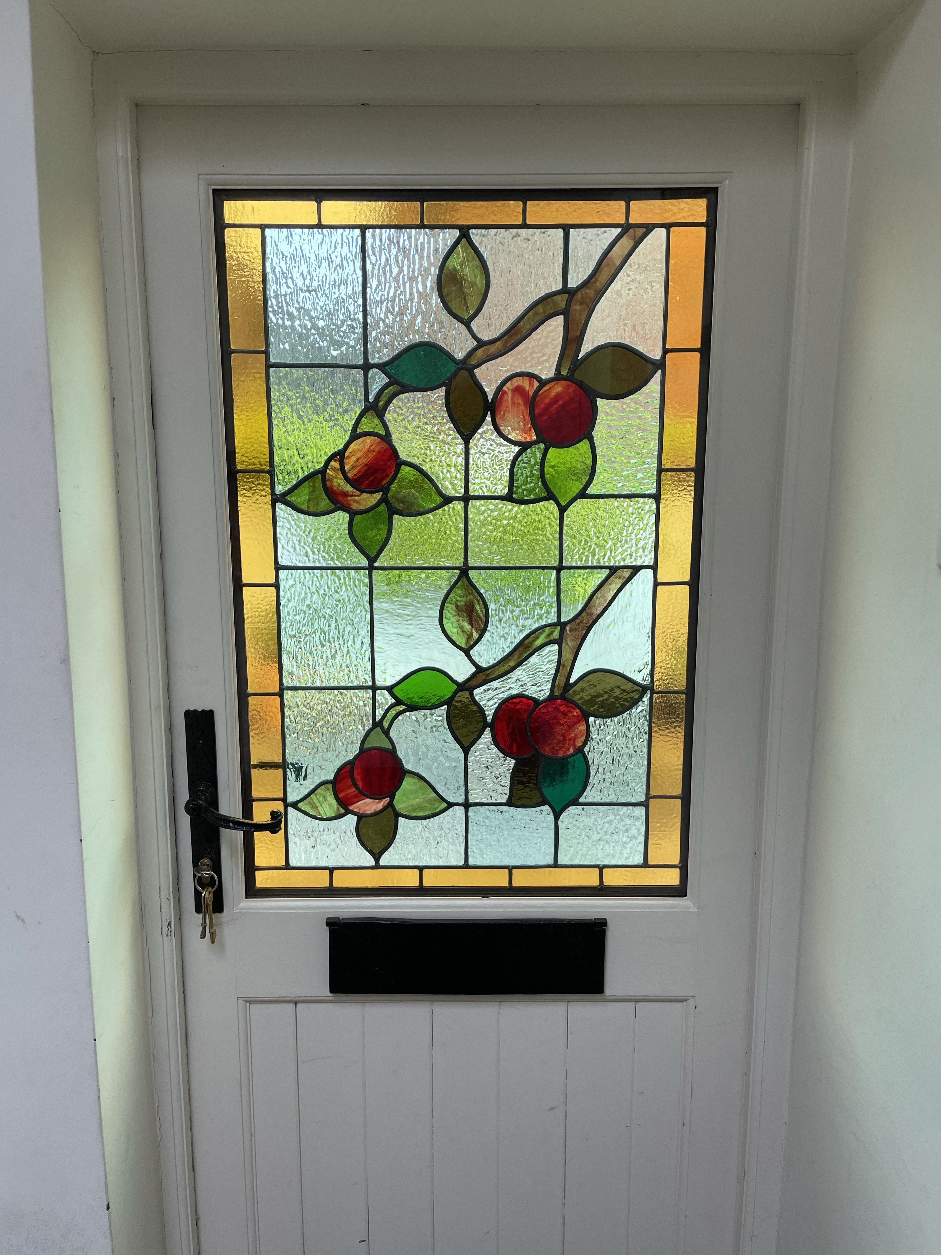 This is our front door or maybe back door. Depends how you look at the cottage. Definitely kitchen door. Made from vintage stained glass which we bought a few years ago. This piece is made from two windows which my husband reset and then triple glazed.