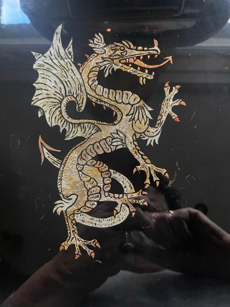 So Bill became a friend. He had travelled a lot in his youth, he’d joined up under age to the army in the first world war and then did odd jobs round the world – I think he may have been a sailor – and he had acquired a lot of souvenirs from these travels. I lived in the house for about two years and every once in a while he would bring me something that he thought I might like. Boxes, handbags, and these two pictures from China. They have been hiding in a cupboard since we moved to this house in 1986, which is a pity as I have always really liked them. So I thought I would give them an airing and a sharing today. The first one is made of foil and the second from stamps on a silk background.