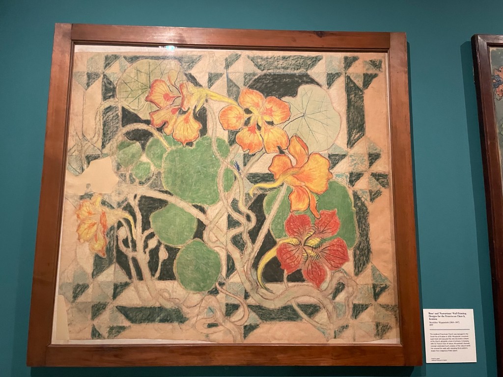 Like William Morris, Wyspiański was a polymath, whose prolific output included church and domestic interior decoration. He designed patterns, wall paintings, stained glass, furniture, textiles, book arts and stage sets. Wyspiański was instrumental in the foundation of the Polish Applied Arts Society (1901), the equivalent of Morris’s Arts and Crafts Exhibition Society.