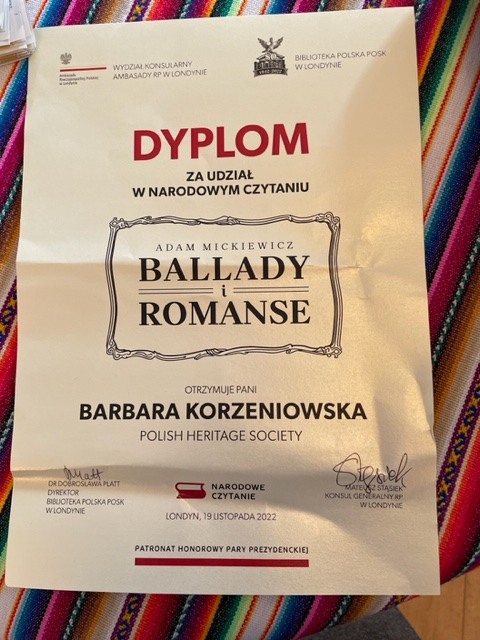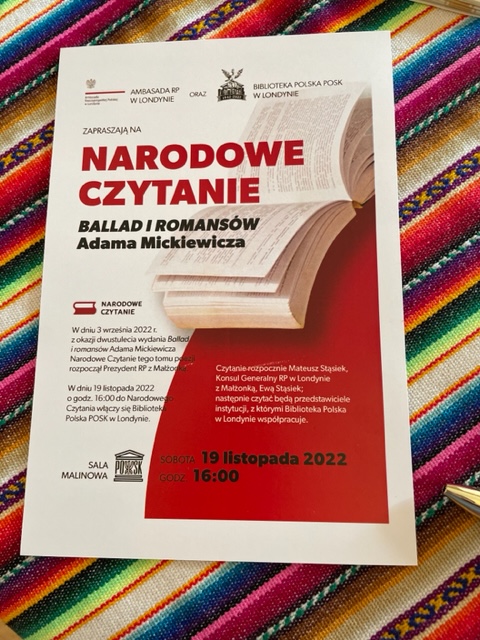 What I hadn’t taken into account, however ,was that this reading would be in Polish, and would be of a romantic ballad written in the 19th century by one of the most well known poets in the country. Adam Mickiewicz. In fact this is the year dedicated to the reading of his ballads and romances and people throughout the whole of the Polish diaspora are holding these events round the world. All The Polish embassies and consulates are involved and so it promised to be quite a prestigious event.