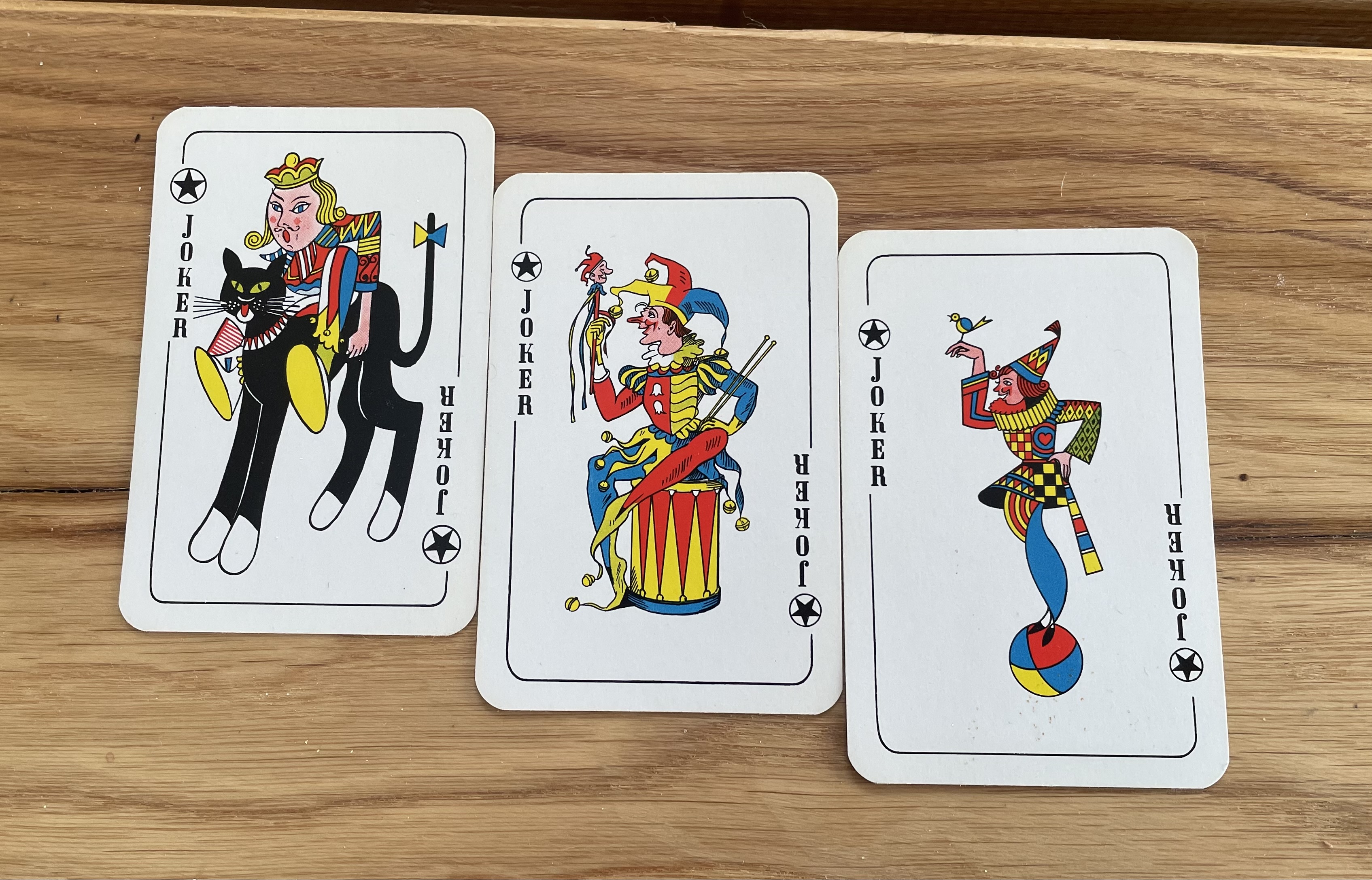 Today I found a very old set ensconced in a leather travelling case, and was very excited when the first joker jumped out at me. I think the black cat is hilarious (note the ribbon on his tail – very apposite for these times), but then so are the other two – a lovely take on Punch and Judy, and then the balancing act.