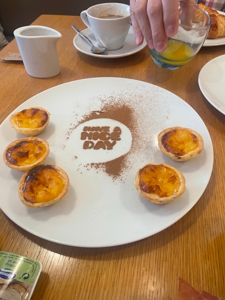Speaking of breakfast, today we were delighted by a birthday surprise for my husband. The waiter arrived bearing a huge plate of little pasteis de nata. Happy birthday.