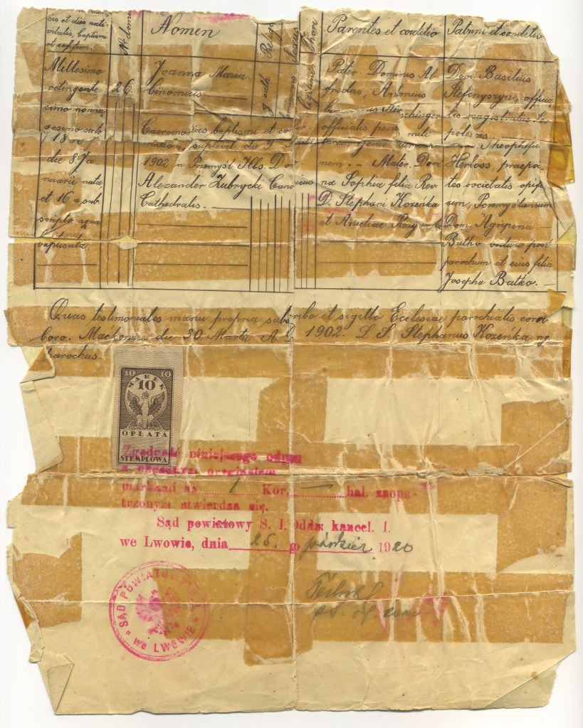 But this is a copy that was requested in 1920. I wonder why. She was already married by then so she would not have needed it for her wedding. My father was already a year old, so presumably she did not need it to have him christened. Maybe to prove that she had been born in Poland. This was also a copy of a copy made in 1902. She was 6. Was it her first communion? Maybe. Though it does mention the word baptism. Sometimes baptism and confirmation took place on the same day. Alexander Zubrzycki was the canon of the Cathedral. (In Przemyśl?) Her religion is stated as Graeco-Catholic. Her grandfather was a pastor, but in which church?