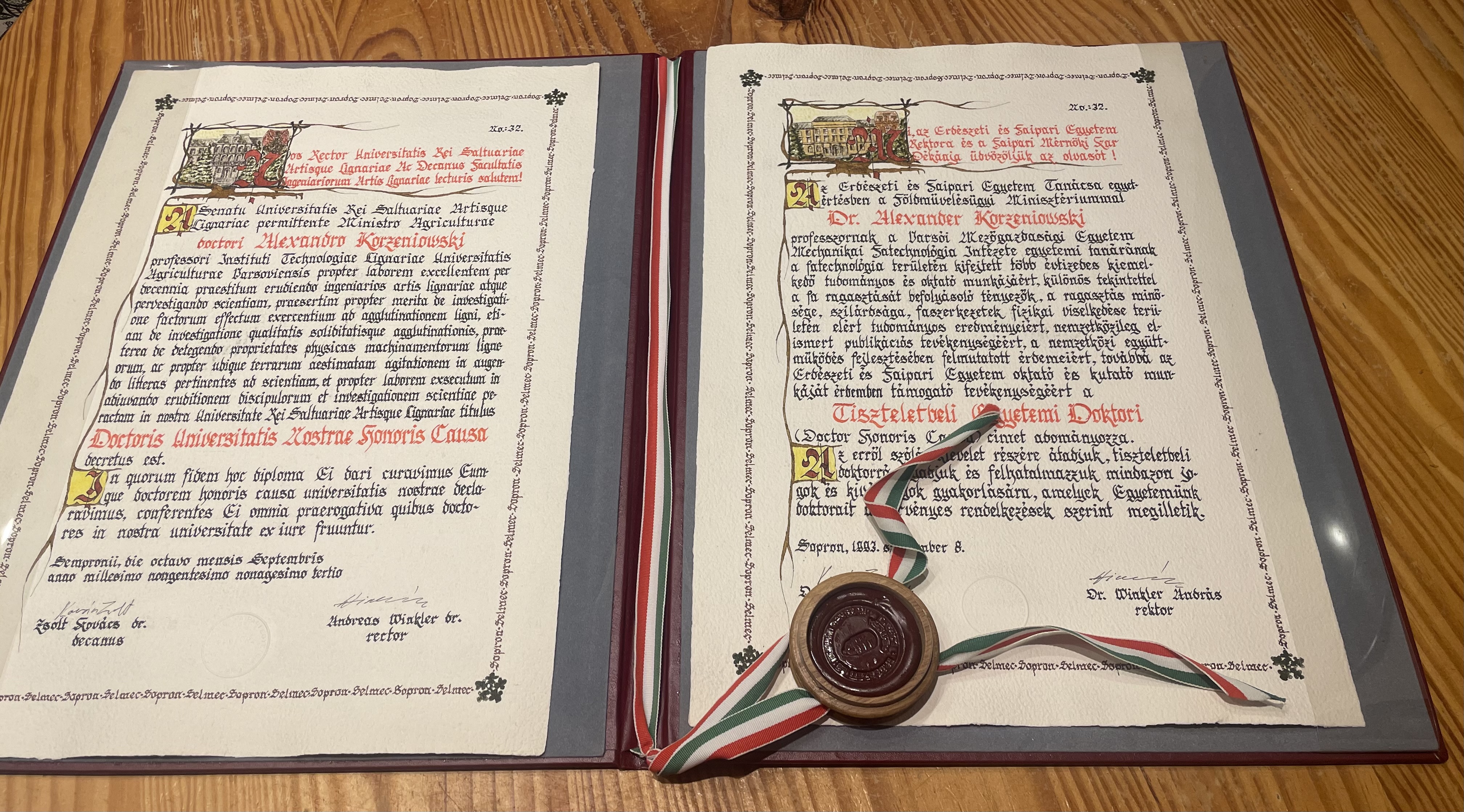 He was Professor of Wood Technology at the University of Warsaw. He was extremely well known in his field. He wrote a book about parquet flooring which he dedicated to his wife. They hadn’t been married long and she must have been so proud of him. I doubt whether she read it, though. But I have just googled it and it is still being quoted today. He received an honorary doctorate from Szopron University in Hungary, The certificate and seal are the biggest I have ever seen.