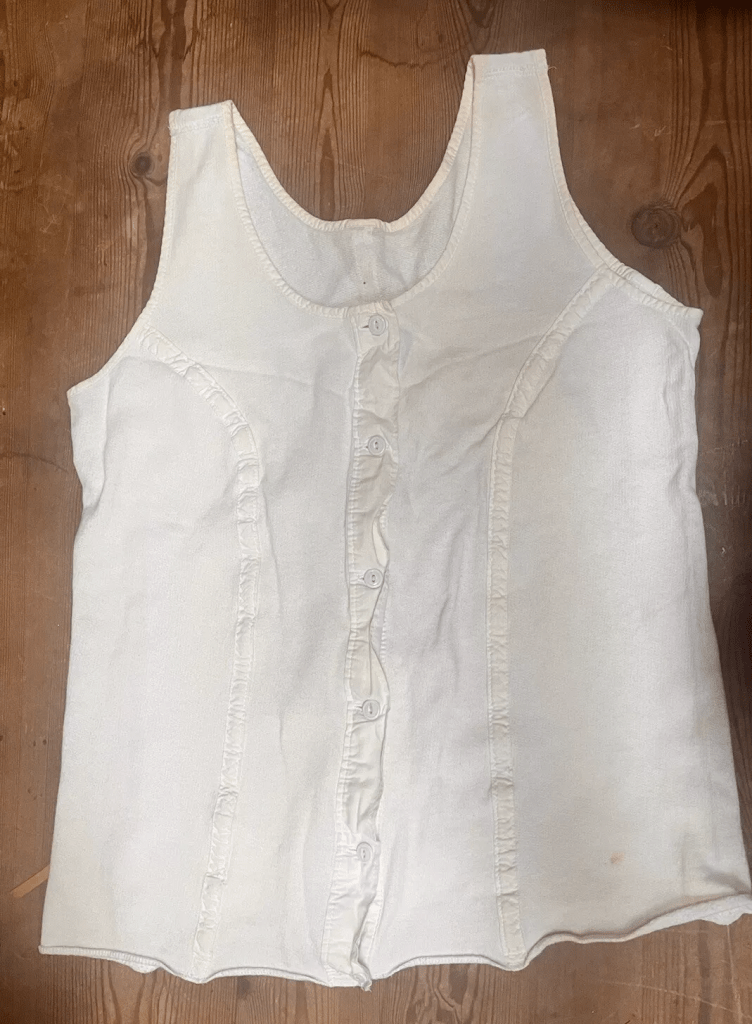 Not for my mother’s daughter. No. Her little girl was going to school with warm tights. Now, tights for adults had not yet been invented – ladies wore stockings and suspender belts, leaving a cold stretch of thigh at the top, but they had nothing better. My mother didn’t wear trousers, but thick woolly jumpers kept her cosy. But she wanted me to be warm too. For whatever reason, she could not get me any warm tights that first winter in school. So I wore thick warm stockings, held up by suspender clips which were attached to a thick, stiff, ridged cotton vest – a liberty bodice. It was so uncomfortable. But I knew better than to say.