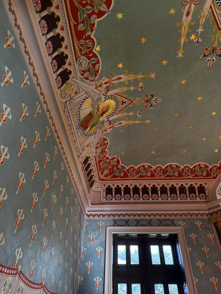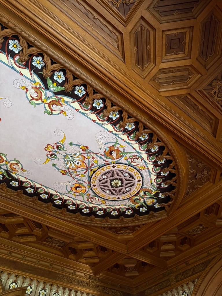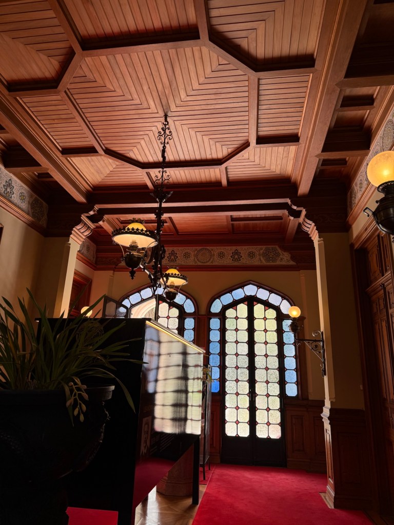 But at the palace doors we were handed plastic foot coverings. Bending down and balancing on one foot to put them on wasn’t an easy option for me. Fortunately the proferror of these Manolos was kind enough to help me slip them on and then we were allowed to view the rather beautiful elements of the art nouveau house. Not very big as palaces go, but enormous for a private house.